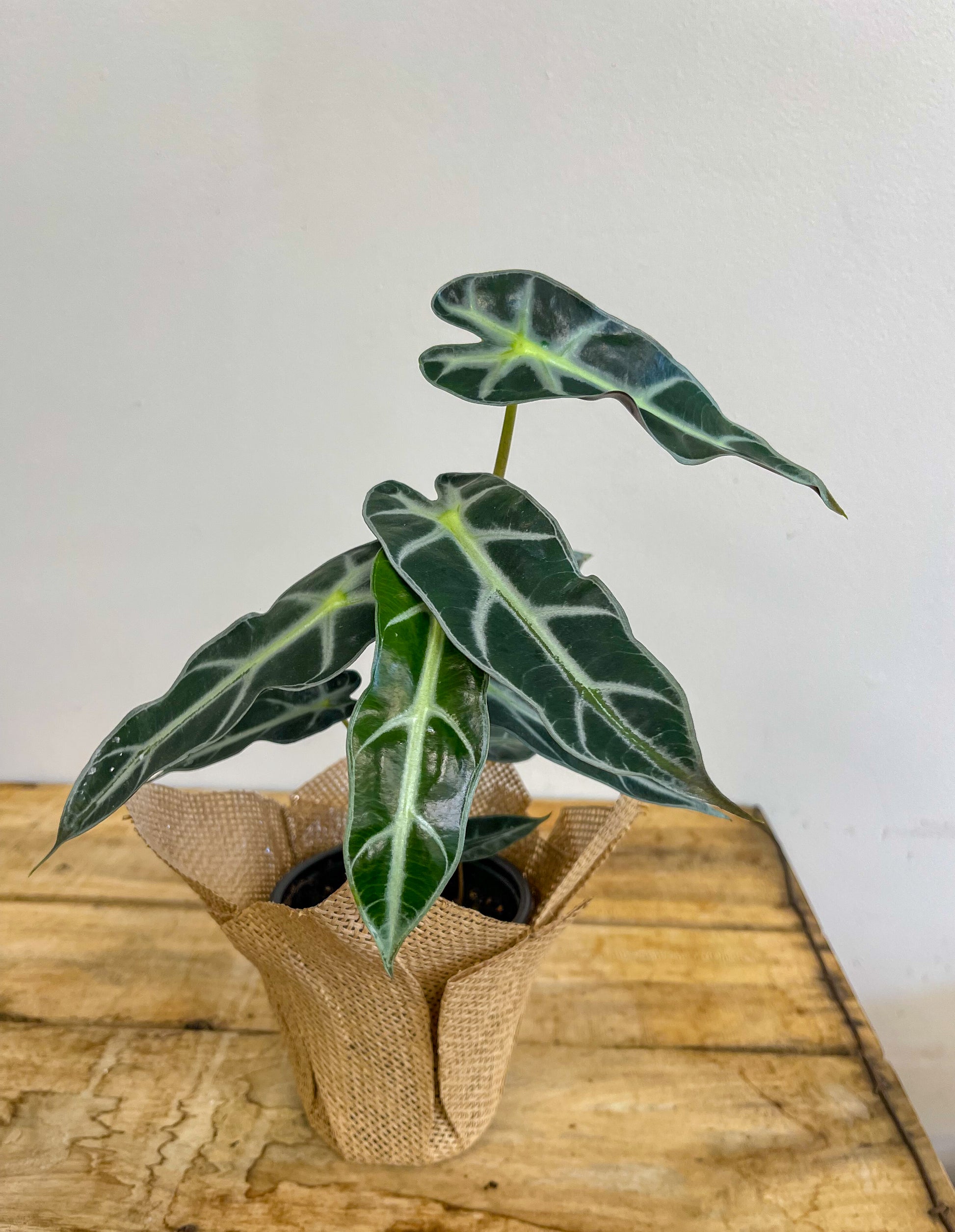 A stunning plant with striking leaves. Small but mighty! This alocasia loves warm climates and bright indirect light with consistent (but not over) watering.