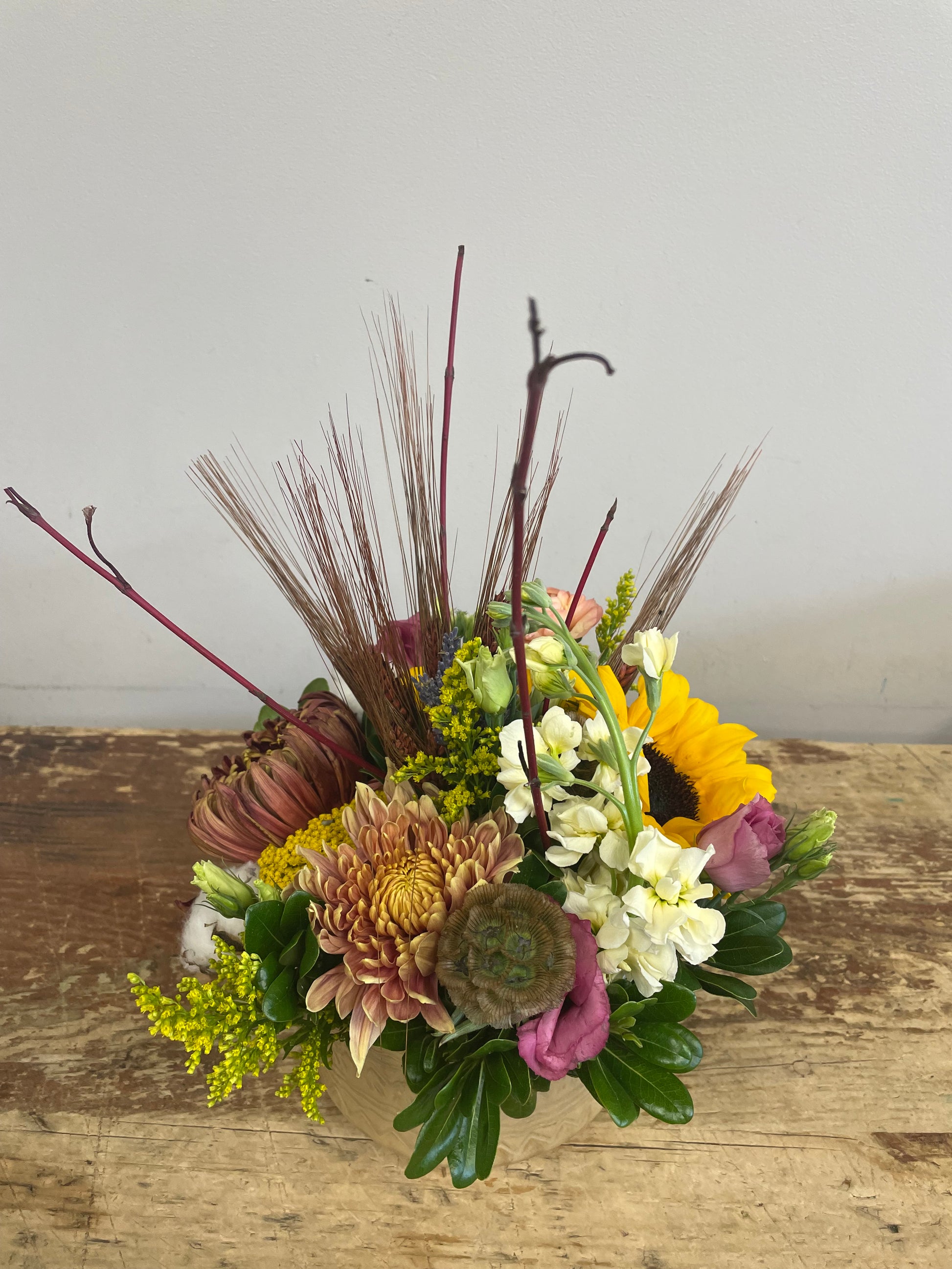 Bring the colors of fall to your table with a fresh, one-of-a-kind arrangement made by our florists. Each piece includes a vase and is designed with the best blooms and greens of the season. Perfect for dinners, gatherings, or just adding a touch of autumn at home.